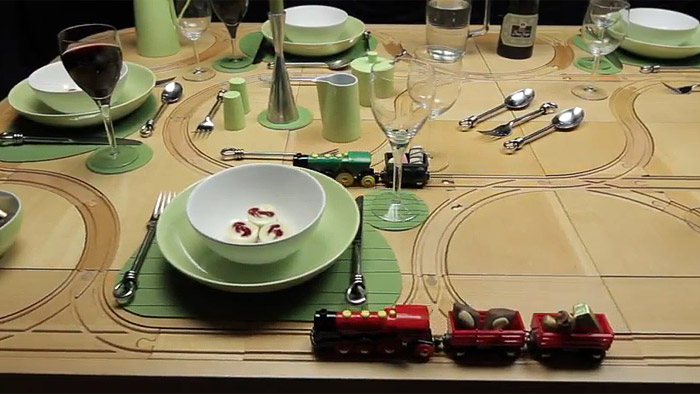 TrackTile Table je jídelní stůl s kolejemi pro vláčky