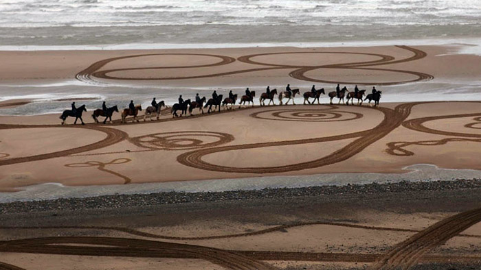Evewright kreslí do písku na pláži chůzí koní a lidí