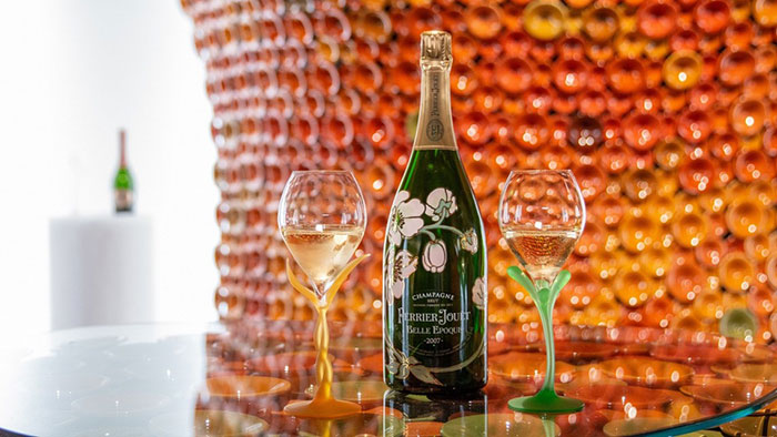 Mancuso navrhl pro šampaňské Perrier-Jouët mobilní sklep i secesní sklenice