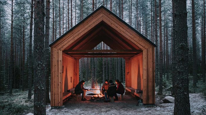 Malin Moisio postavil ve finských lesích přístřešek z recyklovaných materiálů
