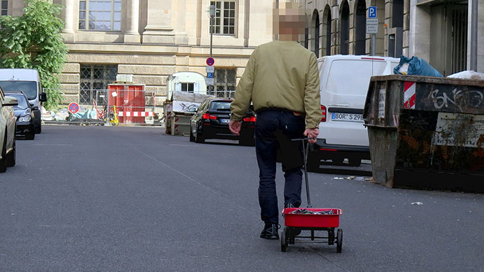 Německý umělec čistí ulice od aut vozíkem s desítkami mobilů