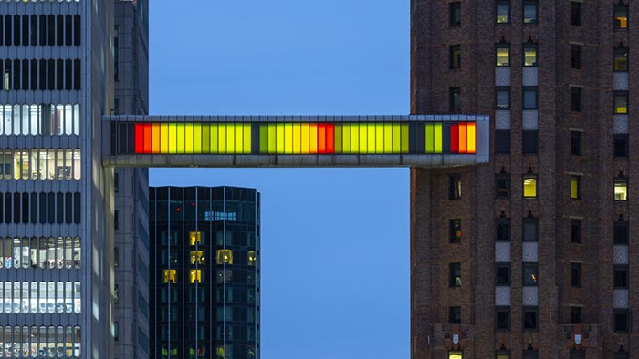 Phillip K. Smith vytvořil v Detroitu světelný most mezi dvěma mrakodrapy