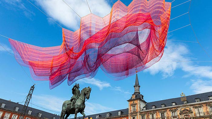 Janet Echelman zavěsila na madridském náměstí Plaza Mayor instalaci 1.78