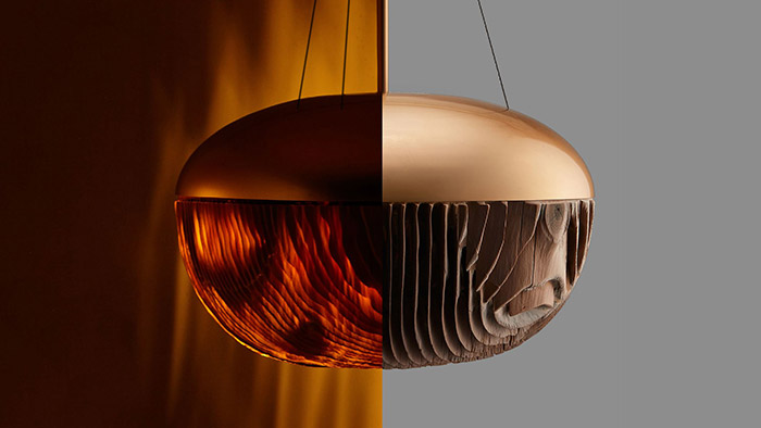 Japonskem inspirované svítidlo Mokumé v sobě kombinuje dřevo a hliník