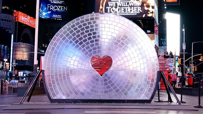 Times Square ozdobila obří 3Dtištěná čočka se symbolem srdce