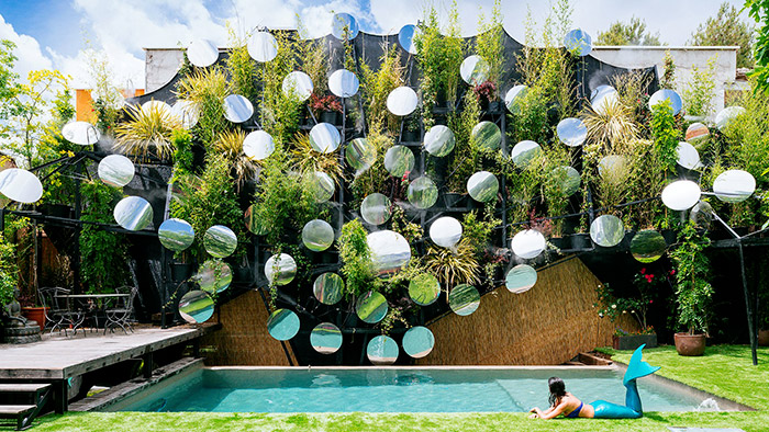 Zelená stěna nad bazénem v Madridu odráží světlo zrcadly