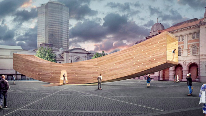 V Londýně staví usměvavý pavilon The Smile z ohýbaného dřeva