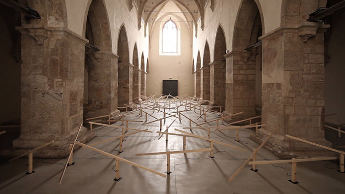 Zimoun vytvořili v rakouském kostele instalaci ze 150 latí