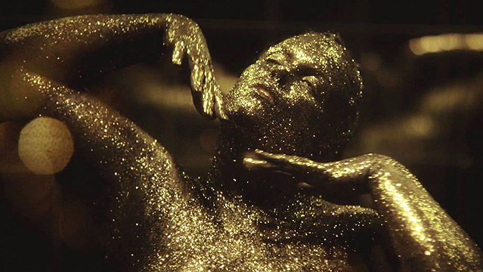 Nahé ženy odvážně ukazují svá těla pokrytá zlatým prachem