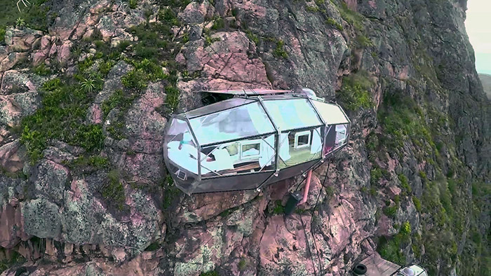 Prosklené buňky Skylodge Adventure Suites visí ve 122 metrech