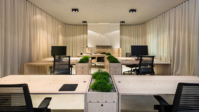 Lublaňské kanceláře s květinami ve stolech dělí dlouhé závěsy