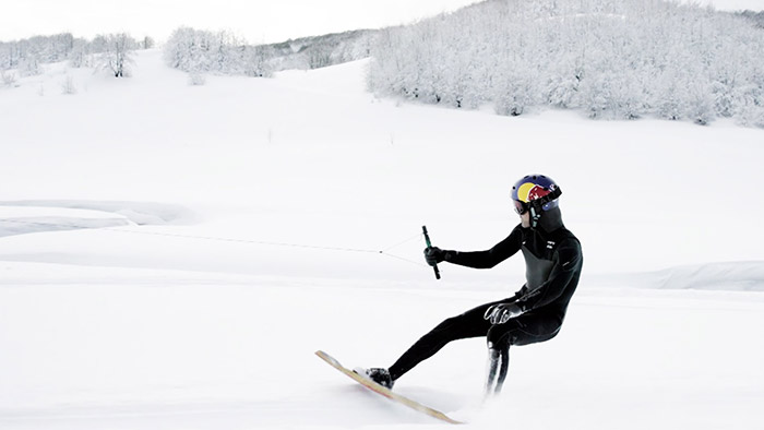 Brian Grubb jezdí v zasněžené krajině wakeskating