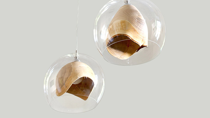 Závěsné svítidlo Teca kombinuje čiré sklo se surovým dřevem