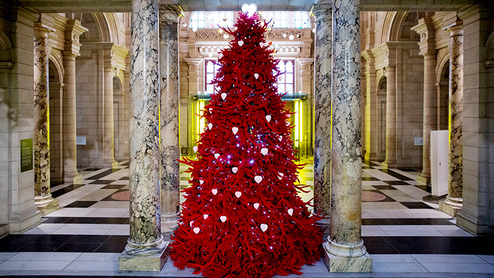 Muzeum V&A má rudý vánoční strom zdobený parožím