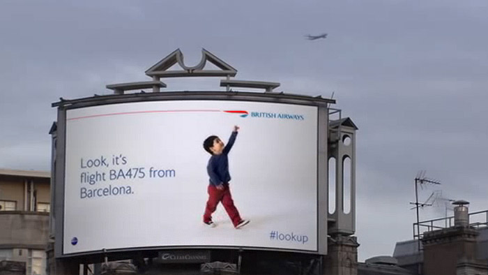 Děti na billboardu ukazují na reálná okolo letící letadla